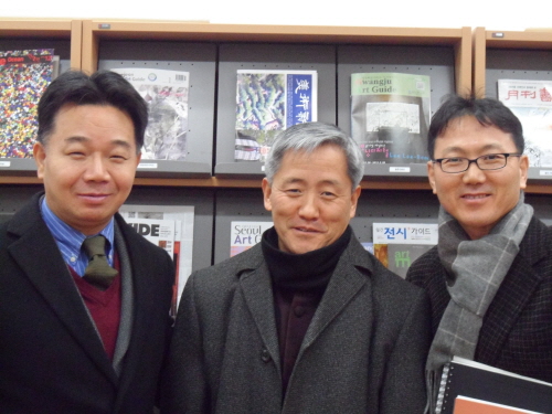 2월 7일 한국미술정보센터에 디지털타임스 IT 융합산업연구소장 겸 선임기자 이규화 씨가 내방했다. 이소장은 월간미술 기자, 디지털타임스 편집국장 등을 역임했다. (사진 이규화 소장, 김달진, 이재건 디지털타임스 광고국 광고기획부장.)