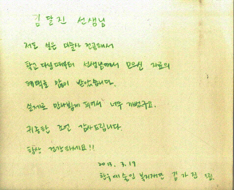 3월 19일 한국예술인복지재단 기획관리팀 허종석 팀장, 김가진 조사·연구담당자가 (가칭)예술인 복지 및 직업 실태조사를 위한 분야별 전문가 자문조사로 한국미술정보센터를 내방했습니다. 김달진연구소에서 "2006년 시각예술인 실태조사 및 분석" 사례 이야기를 나누고 정보센터와 박물관 전시를 보았습니다.