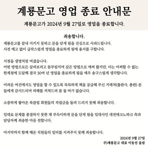 계룡문고는 지난달 27일 대표 명의의 안내문을 통해 "어떤 방법으로든 살려보려고 몸부림치며 갖은 방법으로 애써 왔지만 더는 어찌할 수 없는 한계점에 도달해 영업을 종료하게 됐다"고 밝혔다. 입점해 있던 대전테크노파크 건물의 임대료를 감당하지 못한 게 주요 원인이었다. 이동선(61) 계룡문고 대표는 한국일보와의 통화에서 "그동안 대전테크노파크도 최선을 다하고 많이 배려해 줬다"며 "이전에도 고비가 있었지만 코로나19 팬데믹으로 워낙 타격이 컸고, 매출이 너무 떨어져 이제는 임대료를 공짜로 해 줘도 감당할 수 없겠더라"고 말했다.