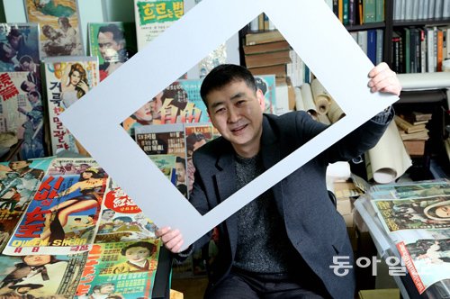 (사진: “1950년대 영화 포스터들이 의외로 화려하고 대담하죠.” 28일부터 동국대 문화관에서 ‘한국영화·연극 희귀자료전’을 여는 안병인 한국애서가클럽 회장이 서울 종로구 돈화문로 사무실에서 액자를 들고 포즈를 취했다. 안 회장은 “연대별 영화 포스터나 광고지를 보면 당시 분위기를 엿볼 수 있다”고 말했다. )